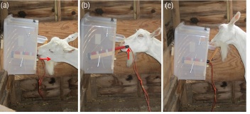 Pour arriver à ce résultat, les chercheurs ont mis au point un protocole expérimental qui met en jeu la gourmandise de ces herbivores. Parquées dans un enclos, bien que convenablement nourries, dans une série d’expériences on propose à leur convoitise des fruits. La série de tests consiste à les placer dans des boîtes translucides. Pour s’en régaler, les chèvres doivent tirer des leviers ou appuyer sur des boutons, et même les deux successivement pour accéder grâce à des trappes et bascules à ces friandises.