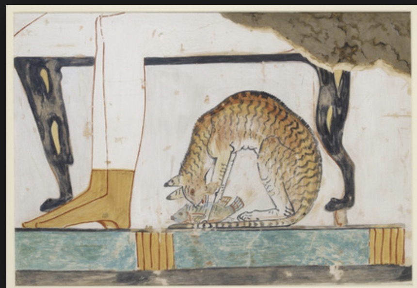 La vallée du Nil et ses ossuaires révèlent la proximité cultivée par Pharaon et ses sujets avec la sous espèce lybica , incarnation de la Déesse Bastet ou Sekhmet, et compagnon apprécié des fellahs car il pourchasse rats et souris qui dévorent leurs récoltes. Pour les remercier on leur sert une pitance sortie du Nil, fleuve nourricier d’un peuple et de ses animaux de compagnie. Sur les murs d’une sépulture près de Thèbes on peut voir se délectant d’une perche du Nil un petit félin au pelage typique de la sous espèce lybica.