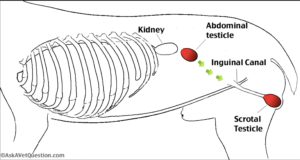 La dichotomie scrotum ou pas scrotum est le résultat du positionnement initial des testicules dans l’embryon. Chez tous les Mammifères les glandes sexuelles apparaissent et se forment dans une région abdominale proche des reins. Par la suite, lors de la croissance du jeune, peu avant qu’il n’atteigne l’âge adulte, les testicules migrent vers la base de l’abdomen comme illustré ci dessous pour ce jeune chien en empruntant le canal inguinal et sont accueillies dans le scrotum.