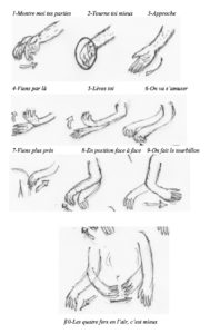 Il m’est resté gravée dans la mémoire de cette ancienne et très joyeuse lecture d’un ouvrage qui par son poids pouvait tomber des mains mais dont le contenu m’avait enthousiasmé, une planche de dessins au trait (p.67) qui illustre la gestuelle amoureuse qu’expriment les bonobos lors de leurs galipettes forestières. Je l’ai ici retranscrite avec maladresse et une très libre traduction de sa légende.