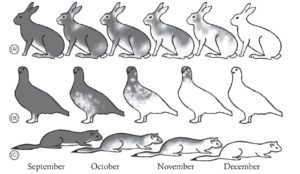 Une vingtaine d’espèces de petits animaux de la zone boréale ou de montagne, mammifères ou oiseaux, changent l’hiver venu la couleur de leurs poils ou de leurs plumes et blanchissent. Les plus connus sont le lièvre de montagne, l’hermine et le renard arctiques pour les mammifères, et la perdrix qui partage ce même territoire.