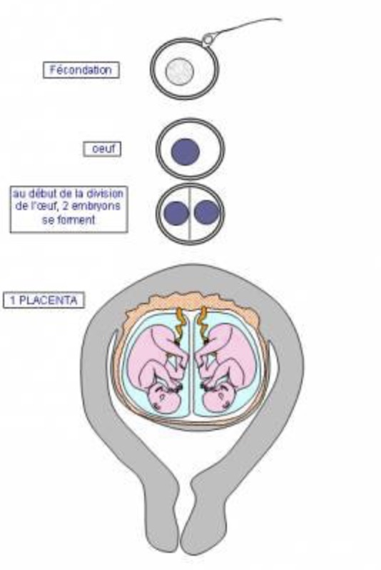 Après la conception, il peut arriver qu’un œuf issu d’une rencontre spermatozoïde-ovule se scinde en deux embryons. Chacun n’acquerra une identité propre qu’au fur et à mesure de son développement dans l’utérus où les deux génomes subissent des mutations. Et au final les génomes de l’un et l’autre jumeaux ne diffèrent que de ces quelques iotas difficile à détecter. Cette différence ténue est plus évidente à la deuxième génération, si l’un des jumeaux a un fils comme illustré ci-dessous, où les mutations propres à l’un des jumeaux sont présentes chez son fils alors qu’elle n’apparaissent pas chez l’oncle