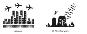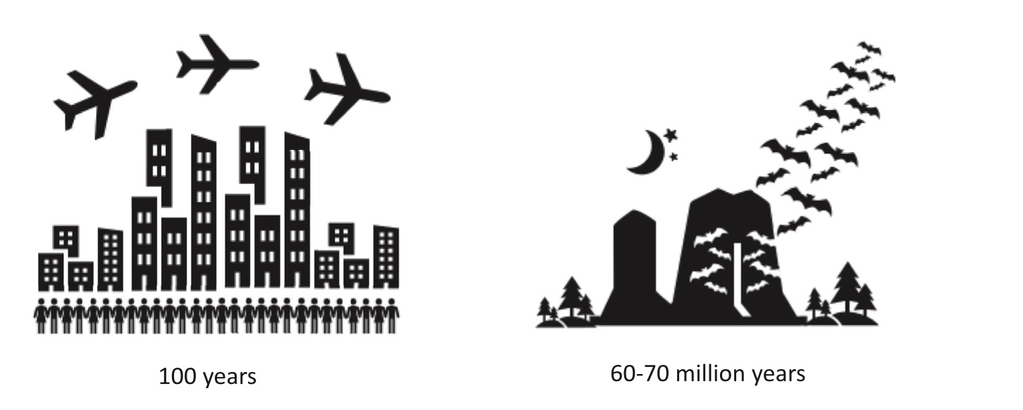 Avec humour, les chercheurs cités font remarquer en deux dessins que les Chauve-souris ont une bien plus longue expérience que nous autres humaines et de la vie urbaine très resserrée et des vols de nuit longue distance, tant il est vrai que les premières cités de nos civilisations ne se sont construites qu’il ya deux ou trois milliers d’années, et que les déplacements massifs d’humains par transport aérien datent d’une petite centaine d’années.