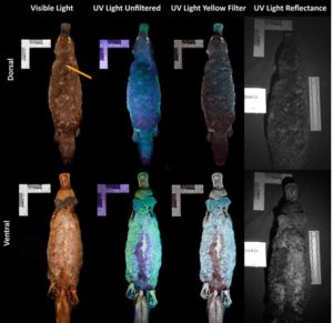 Observons d’abord que la bio luminescence en éclairage UV des premiers cités a été constatée in vivo, chez des sujets vivants, planant d’arbre en arbre de nuit, peut-être pour éviter des collisions, alors que pour les deux autres ce sont leurs dépouilles conservées dans les collections de musées de zoologie qui éclairés d’une source UV se révèlent phosphorescentes.