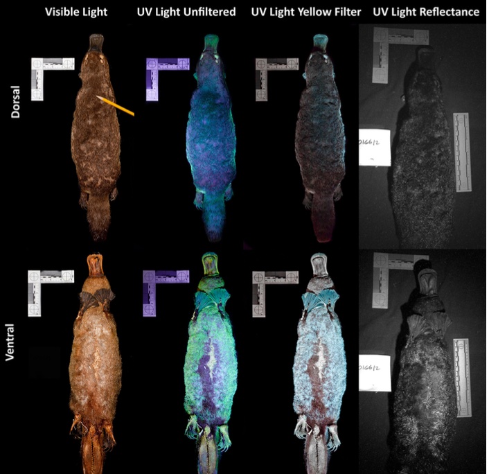 « La nuit les écureuils-volants sont roses » écrivais-je voici quelques mois https://scilogs.fr/histoires-de-mammiferes/la-nuit-les-ecureuils-volants-sont-roses/. Aujourd’hui c’est la fourrure des ornithorynques qui éclairée par des lampes UV s’avère bio-luminescente (2). Et voici quelques années il avait été signalé que le pelage de certains opossums était lui aussi phosphorescent (3).