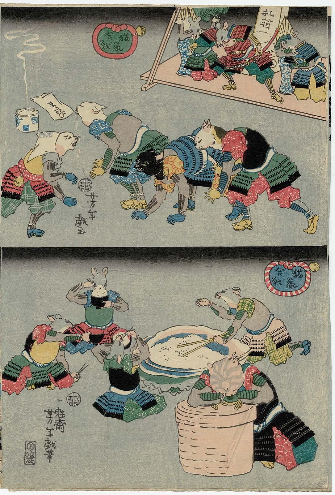 Et puis il faut noter que les chats du Japon ne sont pas en reste et connaissent les mêmes extases que leurs frères d’Europe, mais avec une autre essence : Actinidia polygama ou vigne argentée qui est une liane de la famille des kiwis qui pousse dans les montagnes de Chine et du Japon. Son effet euphorisant sur les chats a été signalé en 1704 par un savant japonais, et une estampe de 1859 due à Tsukioka Yoshitoshi (1839-1892 en illustre joliment les effets : quand les chats se droguent de vigne argentée et dansent, les souris en profitent pour se gaver de riz.