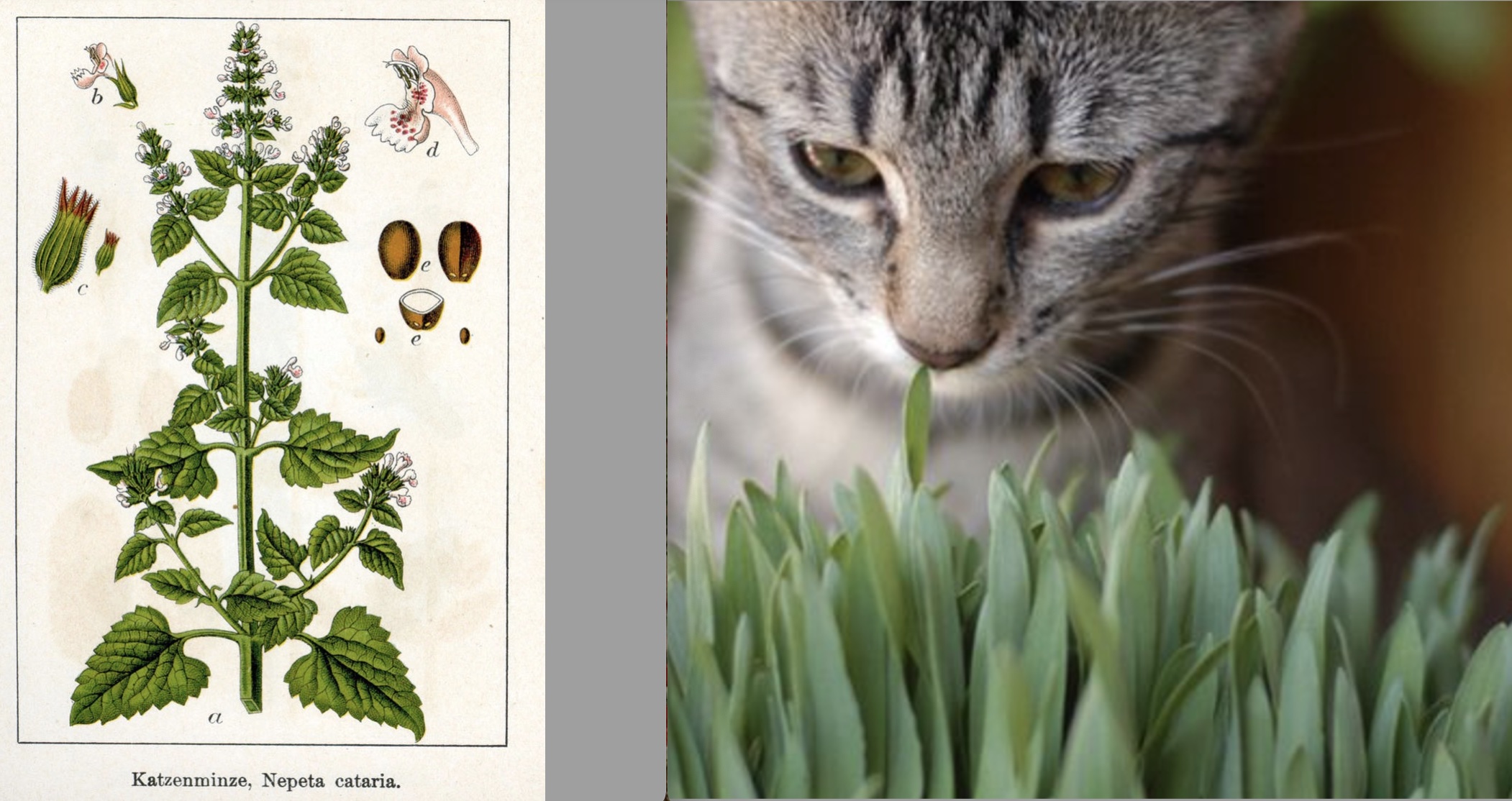 L’herbe-aux-chats provoque chez nos minets des signes de bonheur allant jusqu’à l’extase : ils se roulent sur ses touffes drues, dévorent les fleurs, s’en imprègnent, s’en frictionnent les pattes puis se massent le haut du crâne et tout le corps, les babines dégoulinant de bonheur, les yeux perdus vers des horizons qui n’appartiennent qu’à eux, emportés dans des rêves que nous ne pouvons pas partager. D’ évidence, ça plane pour eux, et l’envolée peut durer… et se répéter. Et l’on vient de montrer que si les chats se frottent à cette herbe c’est pour ne pas être piqués : du cataire commun (Nepeta cataria) émane un puissant répulsif qui éloigne les insectes piqueurs, en particulier les moustiques (1).