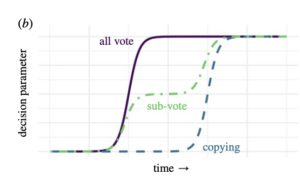 Dans le cas inverse où c’est en copiant l’autre qu’est tracé le chemin, un temps de latence sera observé avant que le troupeau ne s’élance, et sa course aura un parcours plus ou moins erratique (copying sur la figure 1).