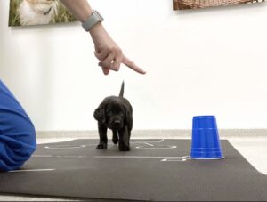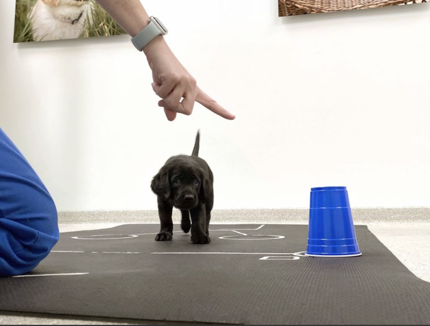 Dans les deux premières on a testé la capacité des chiots à comprendre les gestes des humains. Hors de leur vue on place une croquette sous l’une des coupelles qui leur seront présentées. Puis, soit on désigne du doigt celle où se cache la récompense, soit on montre au chiot un cube jaune placé devant la coupelle garnie.