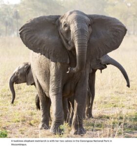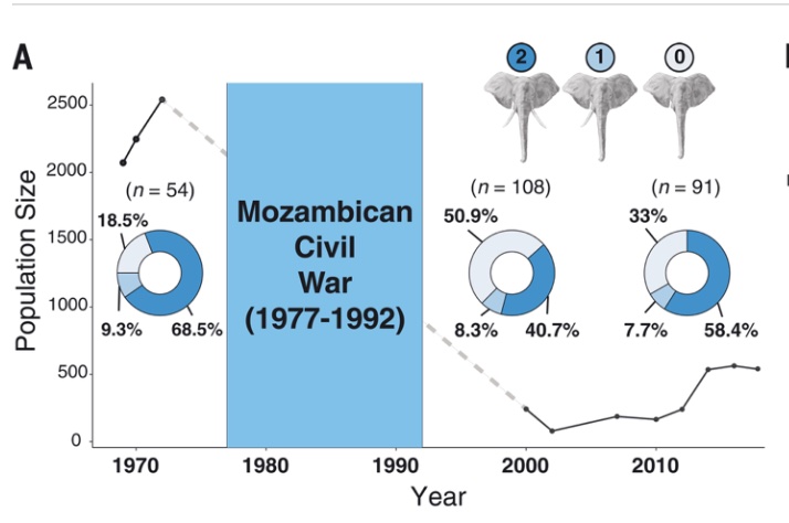 Au Mozambique, de 1977 à 1992 une guerre civile aussi cruelle que vaine a sévi dont le bilan en vies humaines fut considérable, mais qui aussi a décimé les populations d’éléphants qui vivaient dans la région, en particulier dans le Parc National de Gorongosa où l’on croyait eu égard son statut mettre à l’abri des fureurs humaines ses pensionnaires. Il n’en fut rien. Les défenses d’ivoire des éléphants qui y vivaient sont devenues une monnaie d’échanges pour les combattants. Et à l‘issue des conflits, près de 90% d’entre eux avaient été exterminés. Plus de 20 ans après la fin des hostilités, les effectifs d’éléphants augmentent régulièrement, sans pour autant atteindre les densités dont auparavant ils furent gratifiés. Et l’on constate qu’une large proportion d’éléphants femelles qui naissent depuis sont dépourvues de défenses.