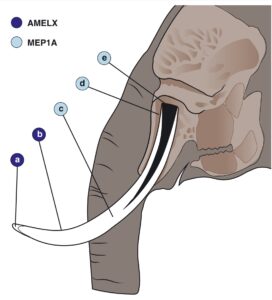 Le schéma suivant explicite le champ d’action des gènes AMELX et MEP1A impliqués dans le développement de la défense de l’éléphant, en l’occurrence une canine à croissance continue faite presque exclusivement de dentine et d’ivoire.