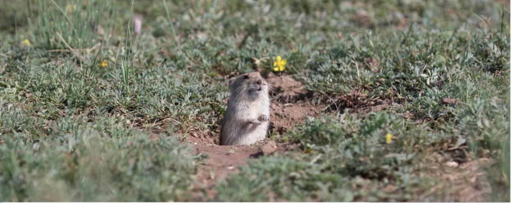 Notre premier jardinier est un campagnol (Lasiopodomys brandtii) qui vit dans les steppes de Mongolie Intérieure où il creuse des terriers pour s’y réfugier. Pour se nourrir il doit en sortir pour récolter différentes graminées qu’il accumule comme réserves dans son terrier. Ces petits animaux, 15 cm de long, constituent de véritables colonies qui occupent ces réseaux de terriers et ont une démographie fluctuante au fil des années : au rythme de 4 portées par an, ils peuvent brutalement pulluler puis les saisons suivantes comme disparaitre du paysage en fonction des conditions météorologiques favorables ou non à la pousse des graminées dont ils se nourrissent; à moins qu’une épidémie virale ne les décime.
