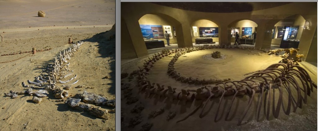 Les espèces de cétacés les plus fréquentes sont Dorudon atrox et Basilosaurus isis. Ci-dessous un fossile de Basilosaurus de 22 m de long tel qu’exposé sur le site ouvert aux visites organisées et présentés dans le musée proche. (Photo Véronique Dauge. UNESCO et Getty Muséum), et sur youtube existent de nombreuses vidéos qui commentent des visites virtuelles.