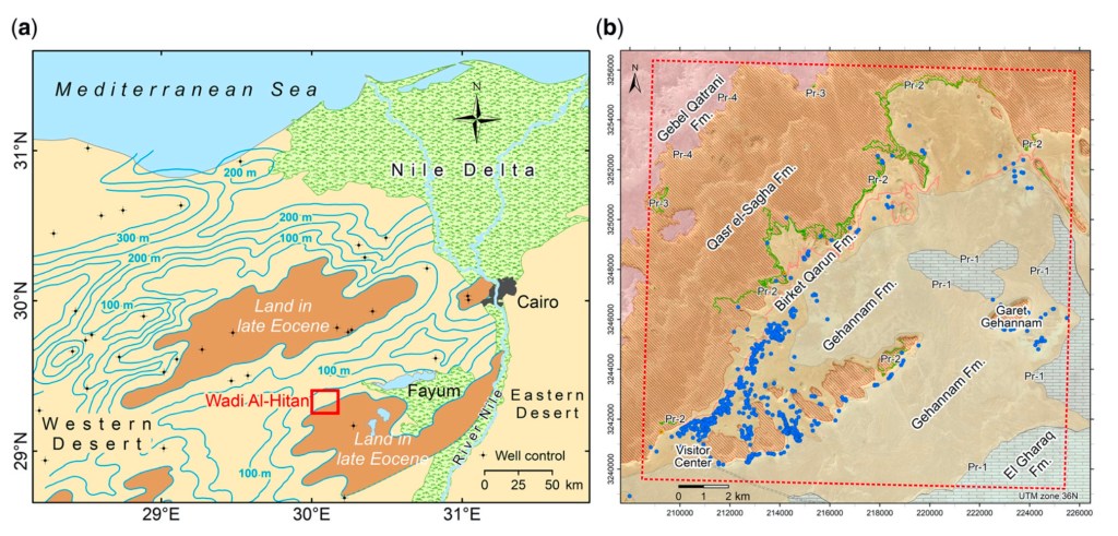 La carte topographique et géologique ci-dessous (a) situe le gisement de Wadi Al-Hitan (carré rouge) et les rivages successifs de la Tethys en bleu avec coloriées en brun les zones émergées à l’Eocène. En b figure la zone protégée, les cercles bleus situant les quelques 500 squelettes de cétacés fossiles , en particulier de Basilosaurus aujourd’hui répertoriés dans le secteur. Ce cétacé anguilliforme atteignait une longueur de 15 à 20 mètres et pesait environ 50 tonnes.