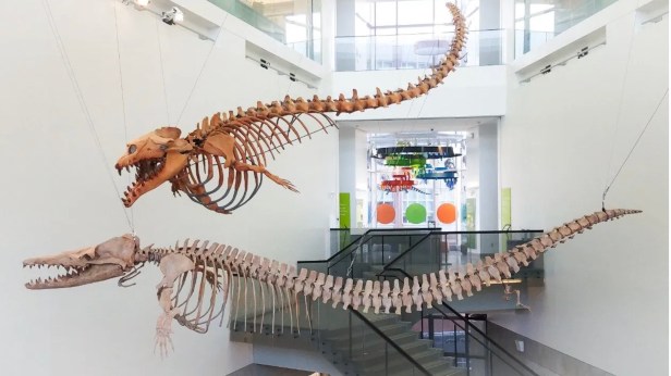 Dans le Muséum d’Histoire Naturelle de l’Université du Michigan qui a organisé de nombreuses et fructueuses expéditions dans cette région.sont présentés un Dorudon atrox au premier plan et Basilosaurus isis