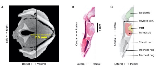 Replis vocaux du chat en vue transversale (A). La ligne jaune mesure la longueur des membranes vocales soit 7.5 mm. En B et C coupe histologique du larynx avec la position des coussinets (pad). Réf. 1.
